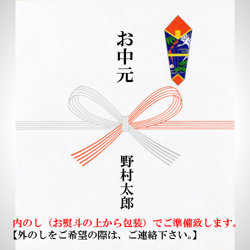 のし紙をご用意しております。 表書き・お名入 等 ご要望をその他お問合せに御書き添え下さい。 ※(内・外)のご指定の無い場合は(内掛け)でご準備致します。