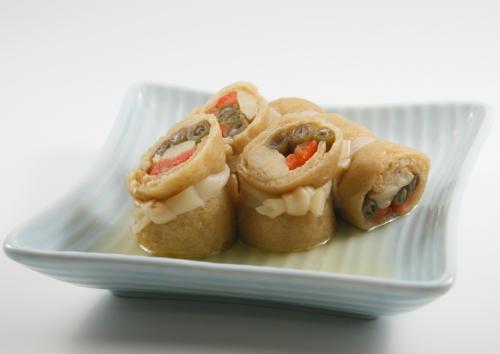 野菜(いんげん・人参)と高野豆腐を油揚げで巻いた細工料理。