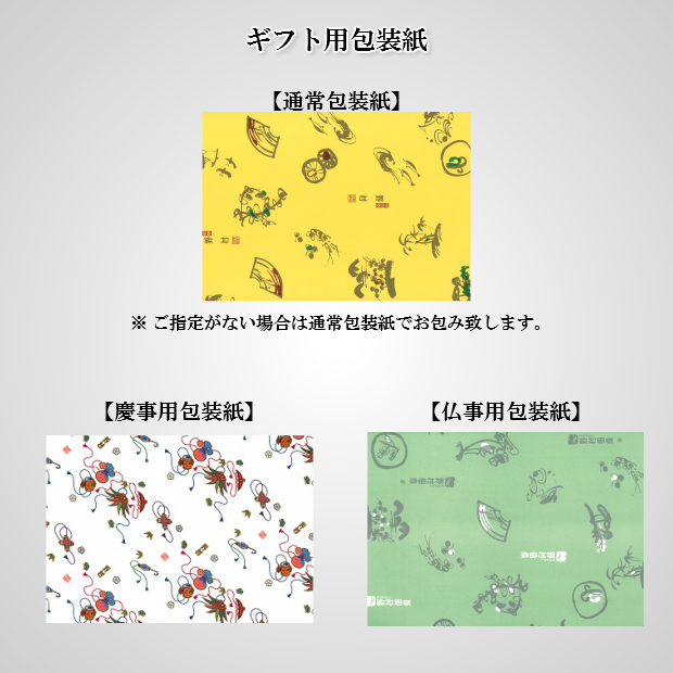 3種類(通常包装・慶事用包装・仏事用包装)の包装紙をご用意しております。ご希望の際は、ご注文時のその他お問合せに