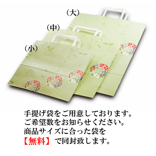 有料手提げ紙袋をご用意しております。 ご希望数をお買上げください。 商品サイズに合った手提げ紙袋を同送させて頂きます。