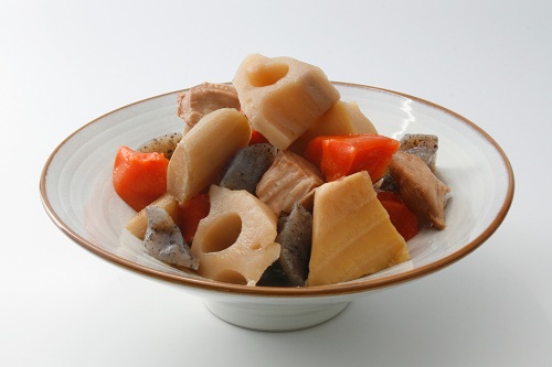 人参、牛蒡、蓮根、蒟蒻、椎茸、かしわ(鶏肉)、土の香りも芳しい根菜類を中心に、京風の薄味仕立てのあわせ調味料の中で、ていねいにアクをとり雑味をのぞきながら、ゆっくり味を染ませました。